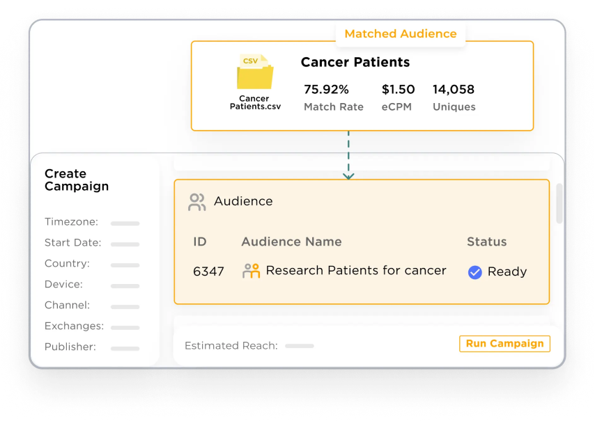 Our Platform matches your NPI list, custom audience list, ready-to-use HCP list, patient list, or CRM data, with up to a 95% match rate, to mobile device IDs, cookies, and IP addresses using both ID-based and cookie-less proprietary patent-pending data matching technologies while keeping consumer’s personal information private.